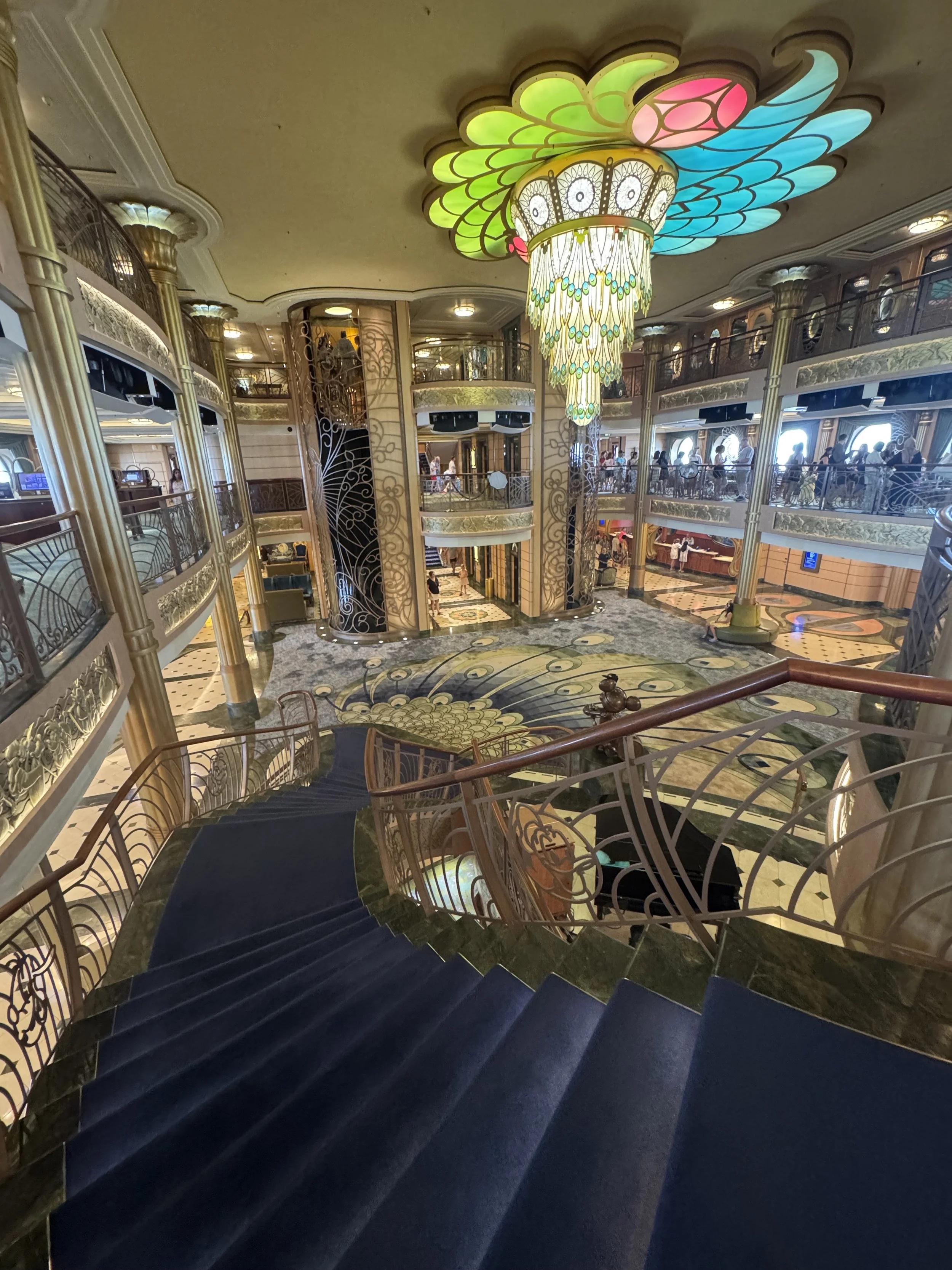 The interior of the ship was such a 1930’s extravaganza. Think Luigi’s Mansion meets Agatha Christie, It was totally my vibe. Marble, fluted edges and lots of crystal and always spotlessly clean. And the consistency of the theming integrating the Disney logo was really stylish.